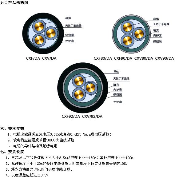 一,CXV92/DA船用電力電纜,天然丁苯絕緣鋼絲編織鎧裝聚氯乙烯護套船用電力電纜,DA型 ,產(chǎn)品適用于各種河海船舶及海上石油平臺等水上建筑物傳輸電能。