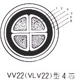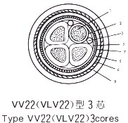 | VV22 | 銅芯聚氯乙烯絕緣鋼帶鎧裝聚氯乙烯護套電力電纜 | 敷設(shè)在室內(nèi),隧道、溝管中,直埋在土壤中,不能承受機械外力,不能承受大的拉力 | |||